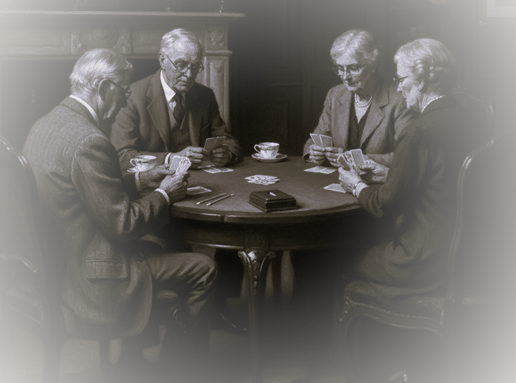 Minulla on uudehko harrastus. Pelaan kerran viikossa bridgeä paikallisessa kerhossa. Tai pelaan ja pelaan, mutta yritys on kova. Bridge on neljän hengen peli, jossa pelataan pareittain. Tarkoitus olisi voittaa toinen pari. Niin kuin tenniksen nelinpelissä, mutta mailat on korvattu korteilla ja pistelaskusta pitää itse huolehtia. Kun tennistä pelataan nurmikolla tai hiekalla, niin bridgen peluu taas tapahtuu vihreän veran äärellä. Niin kuin snookerissa, mutta ilman pelialueen valleja ja keppejä. Istualtaan.